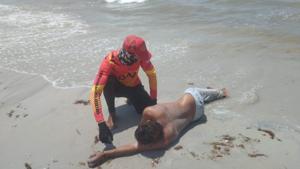 Los salvavidas de la fundación Guajra Aventura reportaron el rescate del jovemn Brayan en el mar Caribe, cerca del muelle turístico de Riohacha.